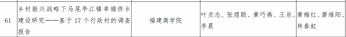 近日,第十六届“挑战杯”福建省大学生课外学术科技作品竞赛落下帷幕,万象城娱乐awc线路项目《乡村振兴战略下马尾亭江镇幸福侨乡建设研究——基于 17 个行政村的调查报告》(项目成员:21级日语3班叶贞志、21级日语2班张煜聪、20级日语2班黄巧燕、20级日语1班王辰、20级商务英语2班李晨,指导老师:黄梅红、廖维阳、林春虹),在全省61所高校1343件作品中脱颖而出,荣获三等奖。据悉,这是万象城官网学生首次在“挑战杯”福建省大学生课外学术科技作品竞赛中获奖,实现了在“挑战杯”比赛上的重大突破。