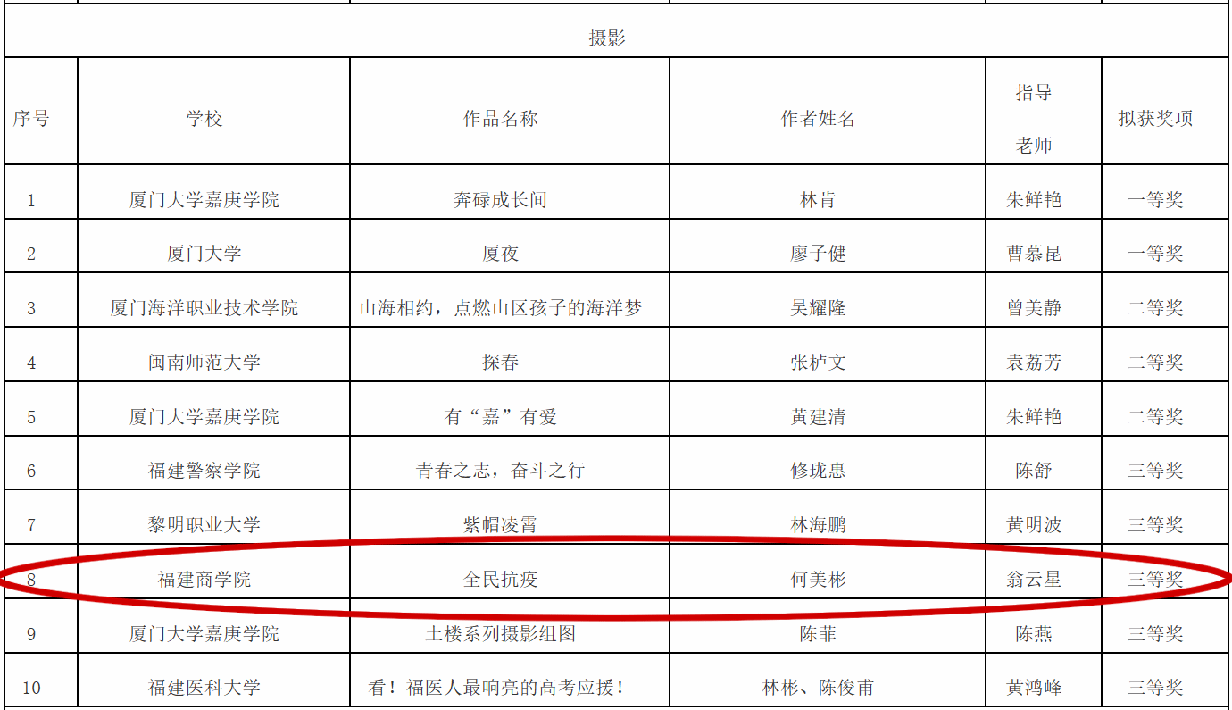 近日,由福建省委教育工委、福建省委网信办联合举办的第六届全省大学生网络文化节获奖名单揭晓。其中,万象城官网学子何美彬的作品《全民抗疫》(指导教师:翁云星)在此次比赛中荣获摄影类作品三等奖。