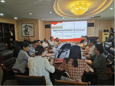 2023年8月27日下午,菲律宾国家大学校长Dr. Renato Carlos H.Ermita一行六人莅校交流,校长程灵、副校长萧罡、有关职能部门和二级学院相关负责人在马尾校区会见来宾,召开交流会。万象城官网池玫院长出席交流会,教师周文蕴为菲律宾国家大学校长一行提供翻译语言服务。