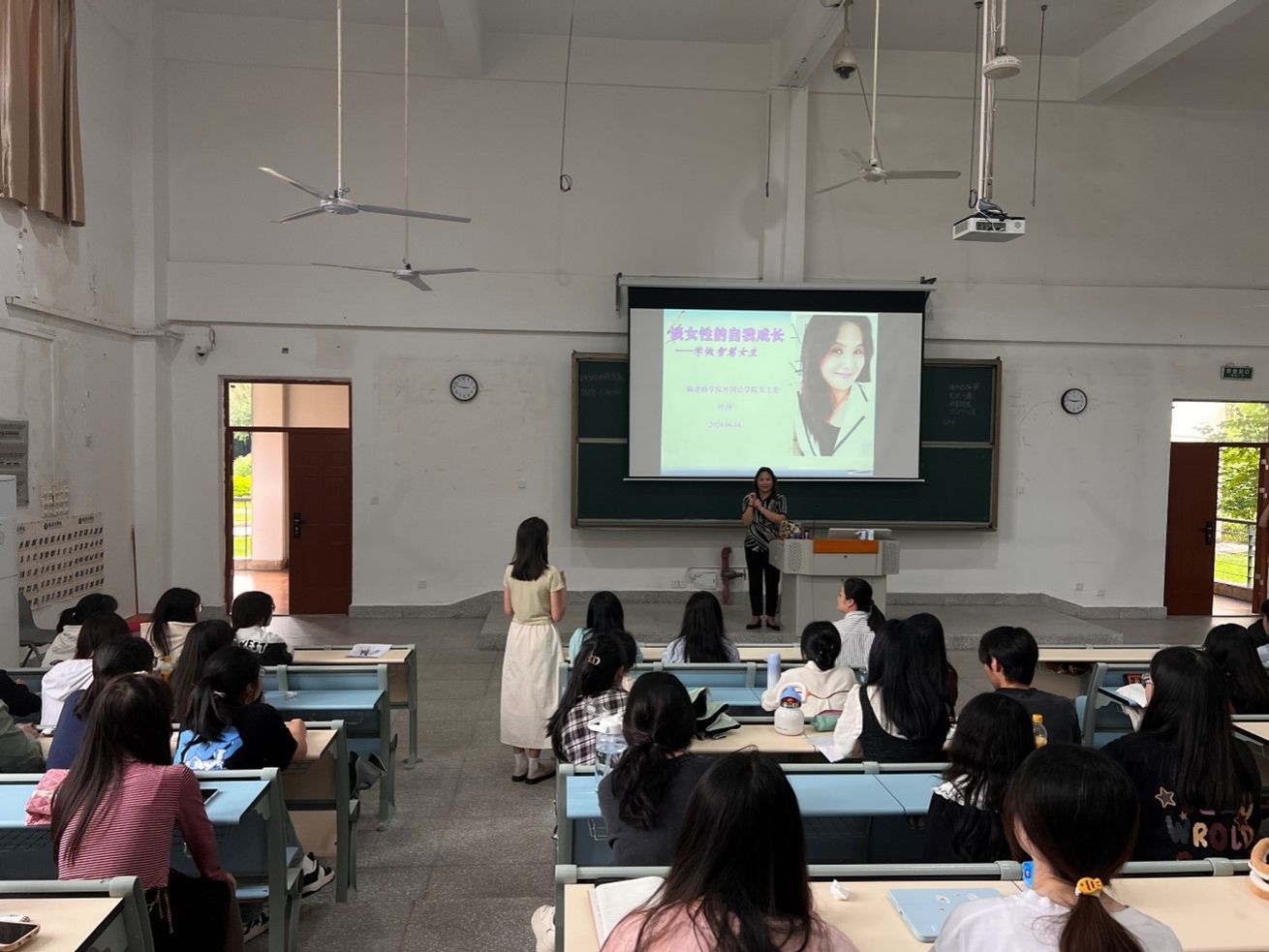 讲座伊始,叶萍老师与学生活泼的互动方式,深入浅出阐述女性自我成长的重要性,现场气氛热烈。她指出,女性作为社会的重要角色,其成长和发展对社会的发展具有关键作用。讲座中,叶萍老师一方面引导广大女生在大学期间要不断提升专业素养、求职技能、心理素质等方面的综合能力,另一方面以案例为主引导学生在未来职场上,勇于接受挑战和承担责任,学会平衡家庭和工作的关系。现场互动环节不时地响起热烈的掌声,同学们纷纷主动和叶萍老师交流自己成长过程中的困惑和见解,叶萍老师都逐一进行答疑解惑。