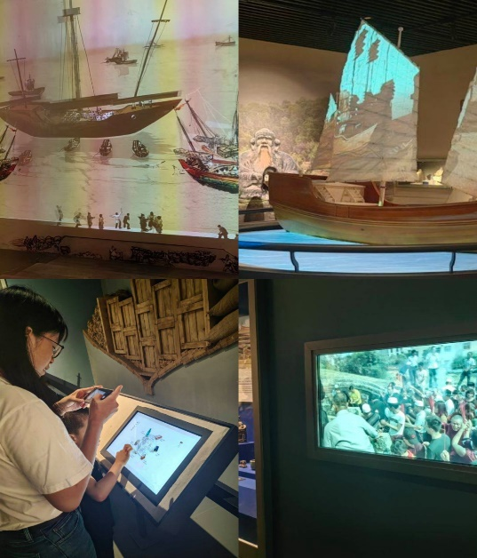 海交馆围绕“泉州湾古船及其伴随出土物、泉州宗教石刻、泉州外销瓷”等三大藏品精心布局,以海上丝绸之路的视角诠释古泉州与世界各民族交往交流交融的活动场景,采用声光电等科技手段,打造出“刺桐梦华图”沉浸式投影体验、“涨海声中万国商”宋元货运氛围投影、“泉州印度教造像舞姿”互动体验、郑和下西洋船队大场景视频等几十项数字化互动内容,生动呈现不同文明不同民族在古代泉州大地上交流互鉴、互融共生的历史事实。在讲解员的带领下,实践队成员们见证了泉州在宋元时期作为海洋商贸中心的盛况。