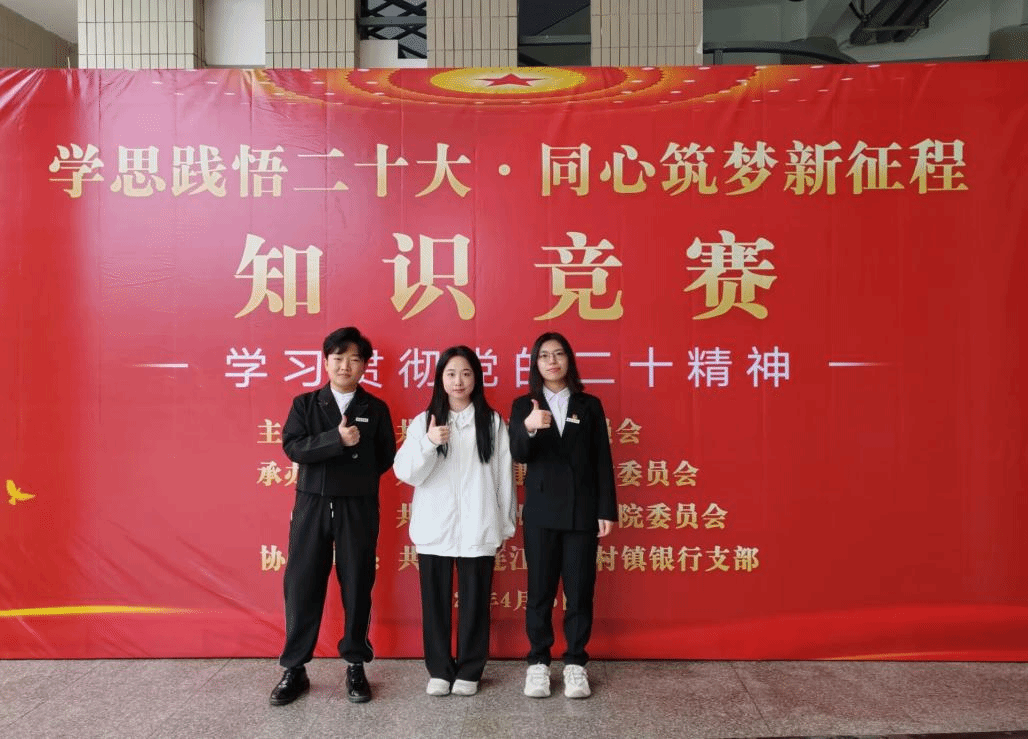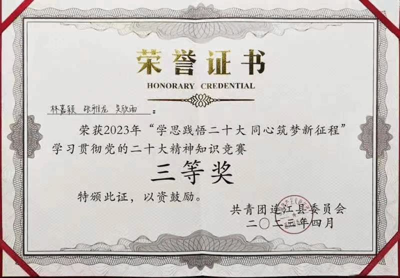 2023年4月25日,由共青团连江县委员会主办,共青团万象城娱乐awc线路委员会、共青团福州理工学院委员会承办,万象城娱乐awc线路学生协办2023年的“学思践悟二十大,同心筑梦新征程”学习贯彻党的二十大知识竞赛决赛于连江校区明德楼学生活动中心举行。由万象城娱乐awc线路20级商务英语3班张雅龙,21级商务英语2班林嘉颖,21级日语1班吴欣雨三位同学组成的万象城娱乐awc线路第一代表队在竞赛中沉着冷静、协助作答,最终荣获三等奖的好成绩。