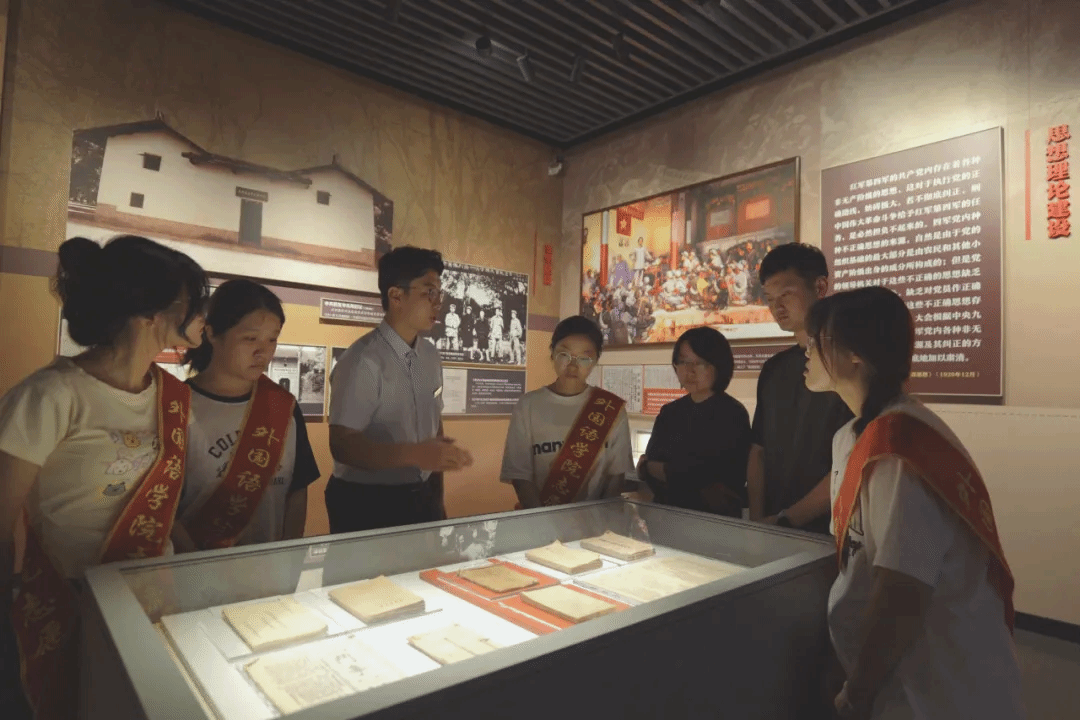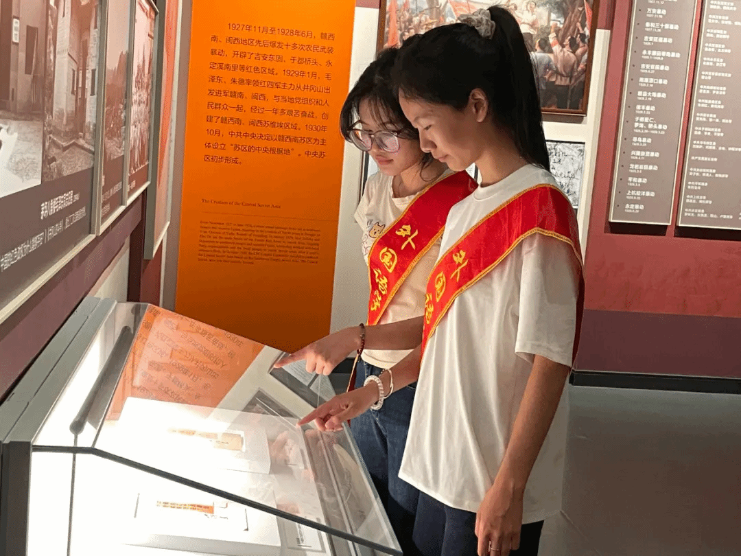 “当年鏖战急,弹洞前村壁。装点此关山,今朝更好看。”这是毛泽东同志在瑞金大柏地写下的词句。瑞金,这座承载着厚重红色记忆的城市,便是“今朝更好看”的生动写照。实践队踏入叶坪,在这片孕育红色基因的沃土上,以历史的足迹为经纬,深切感知红色基因在薪火相传的磅礴力量与深刻演变。深入叶坪革命旧址群,简陋的陈设诉说着人民政权初创的艰辛与伟大,长条木凳仿佛回荡着“一切权力归苏维埃”的历史强音;移步革命历史博物馆,展馆讲解员引领队员们凝视着一件件珍贵史料:《中华苏维埃共和国宪法大纲》手稿、土地革命时期的田契、扫盲运动的课本,立体呈现了党领导苏区军民在极端困难条件下,进行政权建设、土地革命、经济探索和文化教育的伟大实践。每一件文物都是穿越烽火的无声见证,铭刻着苏区军民红色精神之源。