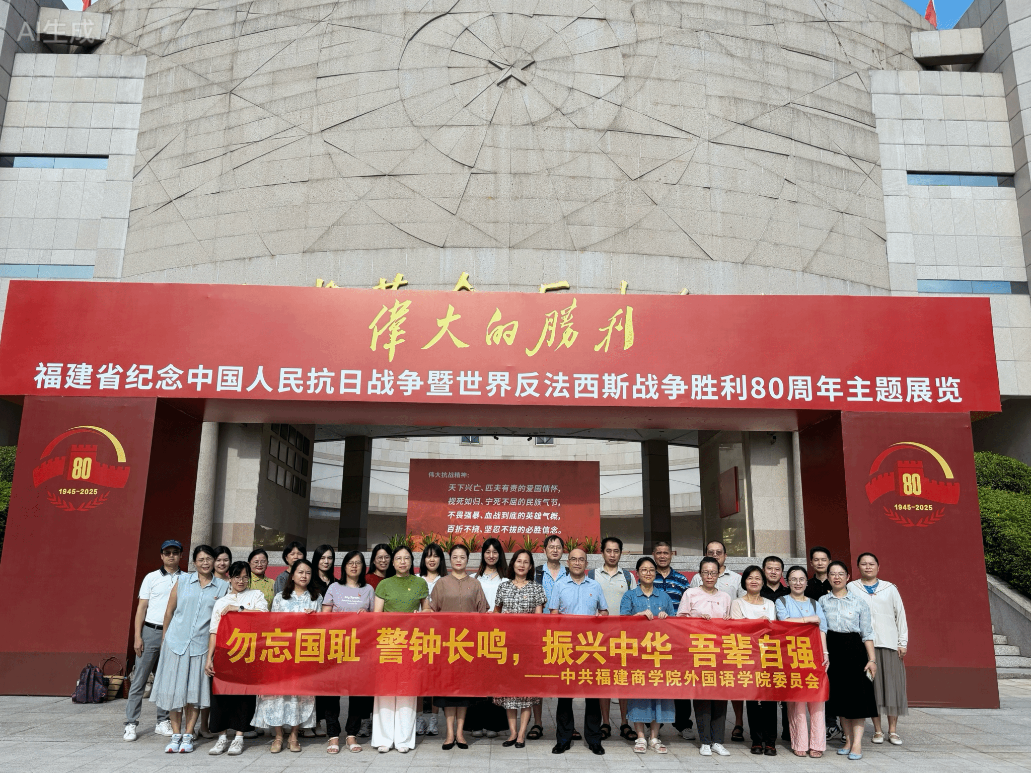 面临国难,我省八闽儿女一呼百应、众志成城、前仆后继,以各种方式参军参战、保家卫国,屡建奇功,谱写了英勇御敌的壮烈篇章。那是一段可歌可泣的历史,是真切热血的,是骄傲自豪的,更证明了我们的民族是不畏强暴、自立自强的伟大民族,我们中国人民解放军始终是党和人民完全可以信赖的英雄军队。教师们也更坚定了忠实履行神圣职责的初心,以伟大的抗战精神鞭策自身,立志为培养新时代外语人才和助力学校建设区域知名商科大学不懈努力。